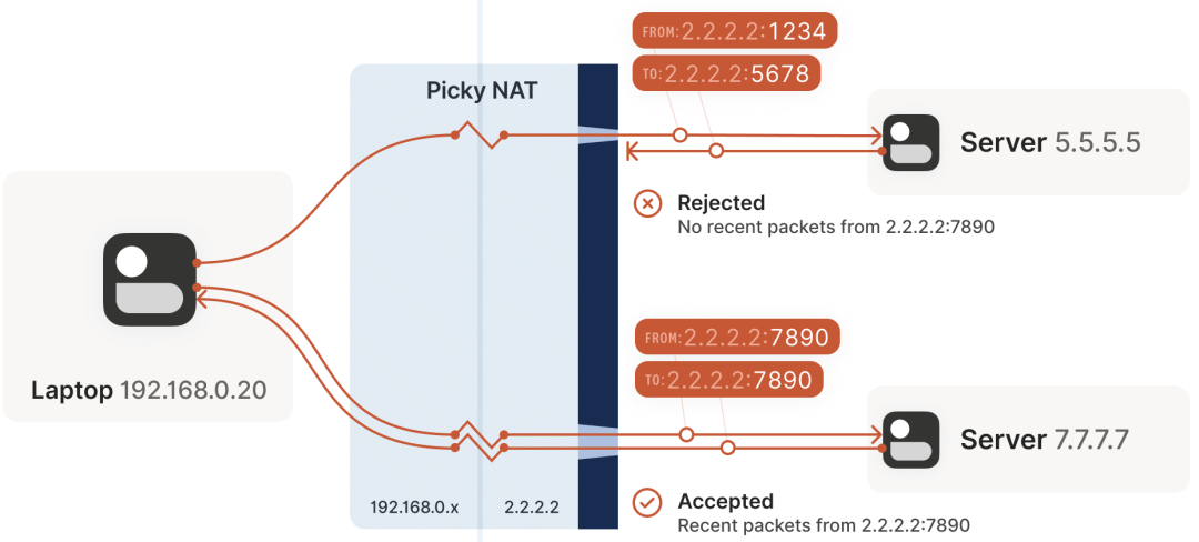注意,这里除了要满足包的 IP 和端口要匹配这一条件之外,并没有要求包必须是相关的(related)。换句话说,只要某些包带着正确的源和目的地址出去了,任何看起来像是响应的包都会被防火墙放进来 —— 即使对端根本没收到你发出去的包。