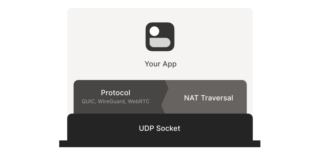 对收发包的 socket 有直接控制权。例如,从经验上来说,无法基于某个现有的网络库实现 NAT 穿透,因为我们 必须在使用的“主要”协议之外,发送和接收额外的数据包。 某些协议(例如 WebRTC)将 NAT 穿透与其他部分紧密集成。但如果你在构建自己的协议, 建议将 NAT 穿透作为一个独立实体,与主协议并行运行,二者仅 仅是共享 socket 的关系,如下图所示,这将带来很大帮助: