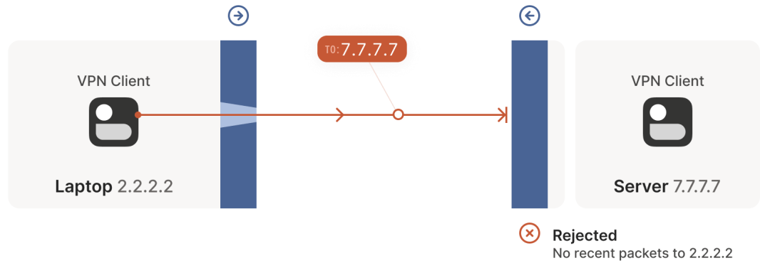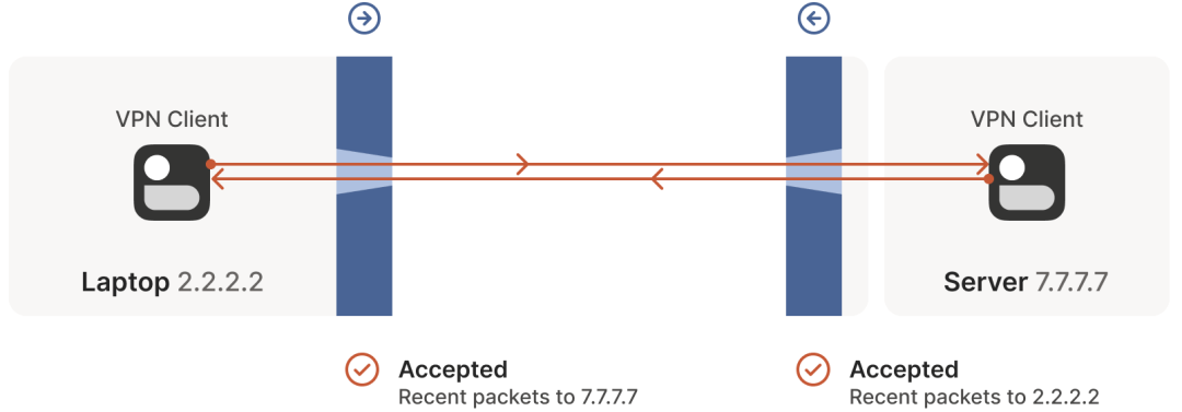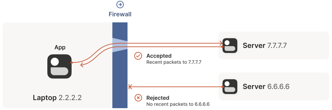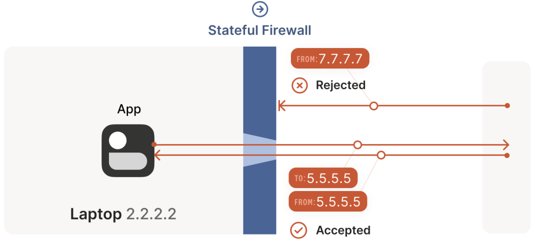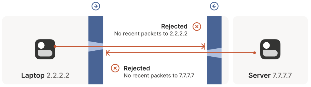 2.2.2.2:1234 -> 5.5.5.5:5678包时,就会记录一下:5.5.5.5:5678 -> 2.2.2.2:1234入向包应该放行。这里的逻辑是:我们信任的世界(即笔记本)想主动与5.5.5.5:5678通信,因此应该放行(allow)其回包路径。某些非常宽松的防火墙只要看到有从