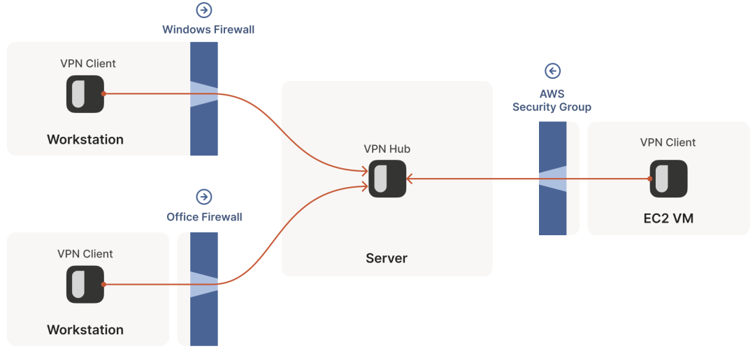但上图是假设了通信双方中,其中一端**(服务端)是能直接访问到的**。在 VPN 场景中,这就形成了所谓的 hub-and-spoke 拓扑:中心的 hub 没有任何防火墙策略,谁都能访问到;防火墙后面的 spokes 连接到 hub。如下图所示: