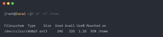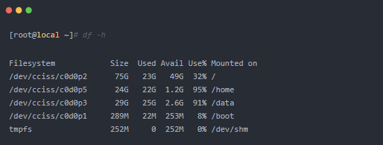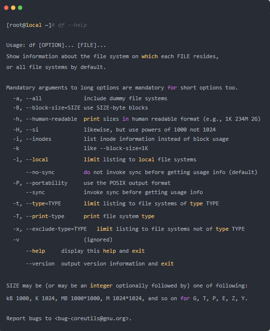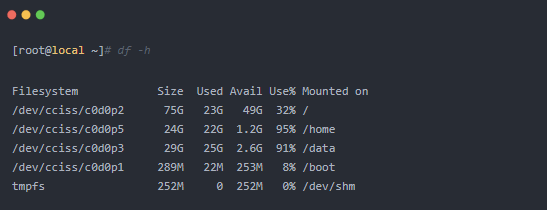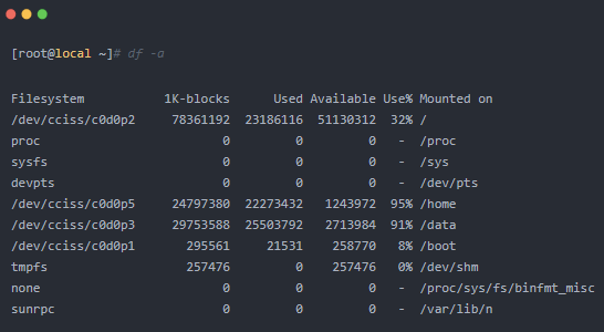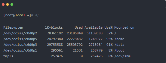 这 df 命令显示文件系统上的设备名称、总块数、总磁盘空间、已用磁盘空间、可用磁盘空间和挂载点信息。