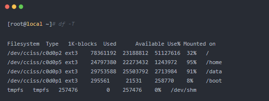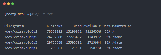 如果要显示某些文件系统类型,请使用 -t 选项。例如下面的命令只会显示ext3文件系统。