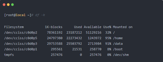 显示所有文件系统信息和使用情况1024-byte块,使用选项'-k'(例如--block-size=1K)如下。