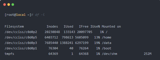 使用 -i开关将显示文件系统的已使用 inode 数量及其百分比信息。
