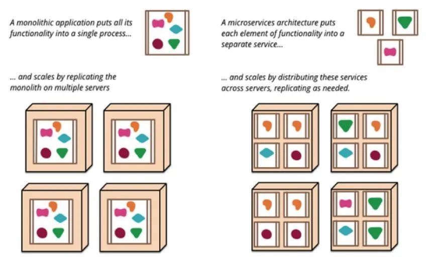 微服务和单体应用的区别,可以用Martin Fowler的这张图来解释: