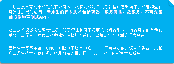 我们以CNCF官方的定义来接着了解。云原生的代表技术包括容器、服务网格、微服务、不可变基础设施和声明式API。那么这些技术都是什么?这些技术有什么联系?