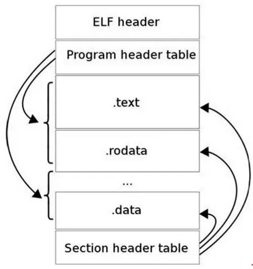 ELF文件格式如下图所示,位于ELF Header和Section Header Table之间的都是段(Section)。一个典型的ELF文件包含下面几个段: