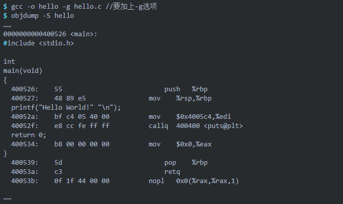 使用objdump -S将其反汇编并且将其C语言源代码混合显示出来:
