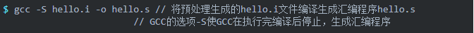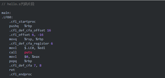 上述命令生成的汇编程序hello.s的代码片段如下所示,其全部为汇编代码。