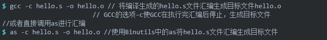 汇编过程调用对汇编代码进行处理,生成处理器能识别的指令,保存在后缀为.o的目标文件中。由于每一个汇编语句几乎都对应一条处理器指令,因此,汇编相对于编译过程比较简单,通过调用Binutils中的汇编器as根据汇编指令和处理器指令的对照表一一翻译即可。