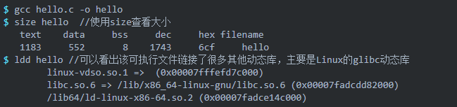 - 如果使用命令“gcc hello.c -o hello”则会使用动态库进行链接,生成的ELF可执行文件的大小(使用Binutils的size命令查看)和链接的动态库(使用Binutils的ldd命令查看)如下所示: