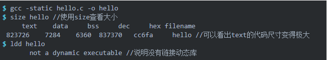 - 如果使用命令“gcc -static hello.c -o hello”则会使用静态库进行链接,生成的ELF可执行文件的大小(使用Binutils的size命令查看)和链接的动态库(使用Binutils的ldd命令查看)如下所示: