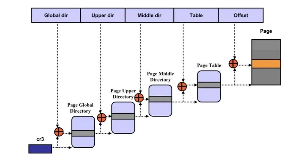 虚拟地址和物理地址的映射关系存储在页表中,而现在页表又是分级的。64位系统一般都是3~5级。常见的配置是4级页表,就以4级页表为例说明。分别是PGD、PUD、PMD、PTE四级页表。在硬件上会有一个叫做页表基地址寄存器,它存储PGD页表的首地址。