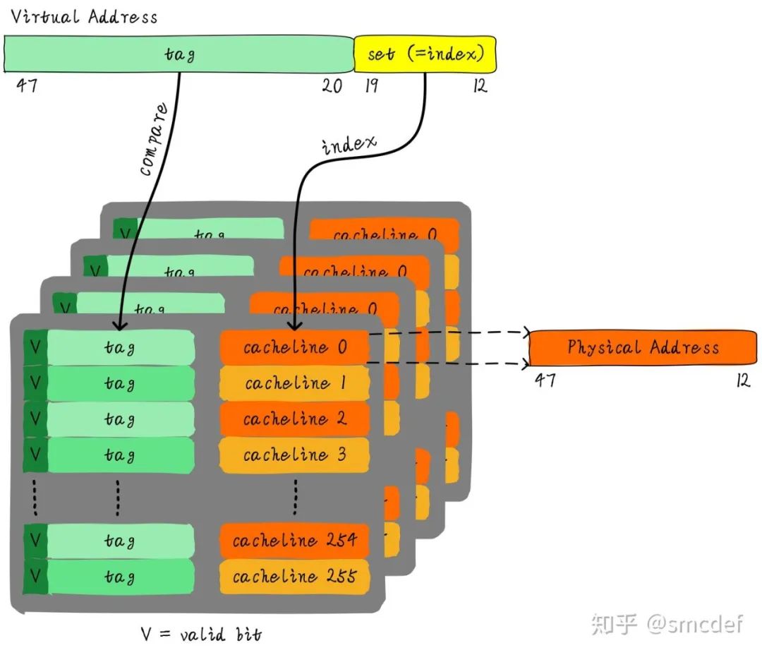 TLB其实就是一块高速缓存。数据cache缓存地址(虚拟地址或者物理地址)和数据。TLB缓存虚拟地址和其映射的物理地址。TLB根据虚拟地址查找cache,它没得选,只能根据虚拟地址查找。所以TLB是一个虚拟高速缓存。硬件存在TLB后,虚拟地址到物理地址的转换过程发生了变化。虚拟地址首先发往TLB确认是否命中cache,如果cache hit直接可以得到物理地址。否则,一级一级查找页表获取物理地址。并将虚拟地址和物理地址的映射关系缓存到TLB中。既然TLB是虚拟高速缓存(VIVT),是否存在别名和歧义问题呢?如果存在,软件和硬件是如何配合解决这些问题呢?