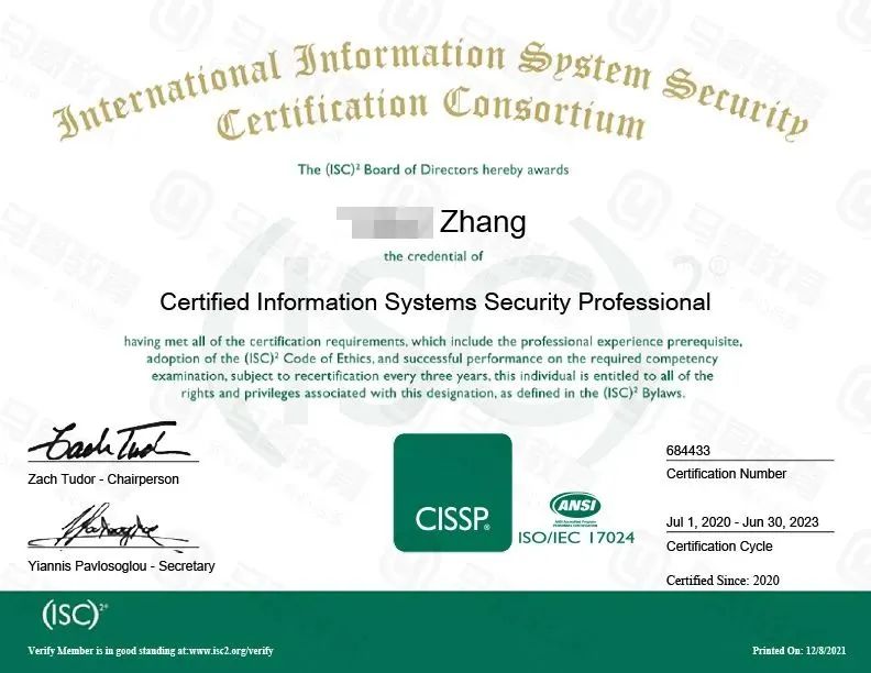 张翊老师CISSP证书