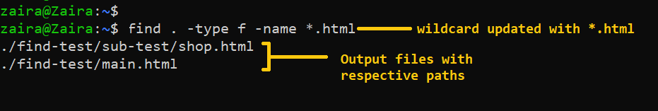现在,假设我们要查找具有特定扩展名的文件,例如 .我们将修改命令,如下所示:.html