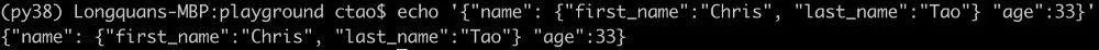 echo '{"name": {"first_name":"Chris", "last_name":"Tao"} "age":33}'