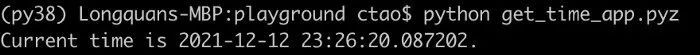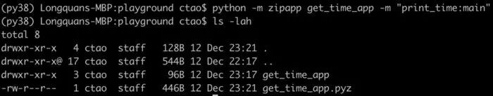 如果我们想要创建一个简单的应用,比如前面写的获取当前时间的应用程序,我们不必再需要像 PyInstaller 这样的第三方工具包,Python 内置的 Zipapp 就可以做到。假设我们要打包成一个"Get Time"的应用,我们可以在命令行运行下面的命令。