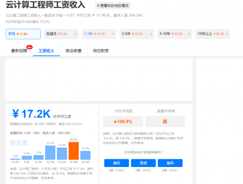 首先云计算可以选择的从业方向有很多,常见的有云计算工程师,云计算开发,云计算运维工程师、云计算架构工程师等很多方向,就拿云计算工程师为例,仅仅云计算工程师的平均薪资就能够拿到17.2K左右,应届生也能够达到9.4K的平均水平。在所有的云计算工程师从业者中有超过26%的人能够拿到20~30K的薪资水平。足以证明行业的薪资水平还是非常高的。