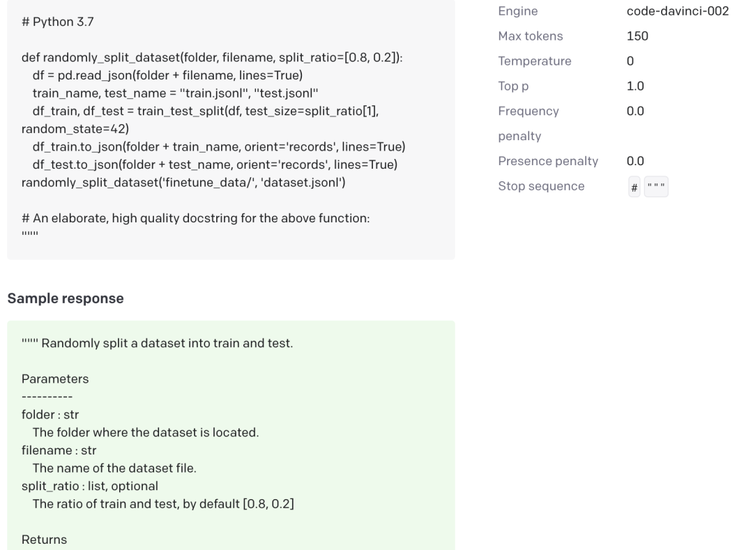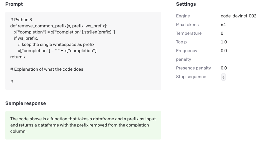 最后,我不建议大家运行code-davinci-002模型,对国内朋友来说,成本太高了。如果想看效果,可以到OpenAI官网看看文档、在线运行一些example即可。