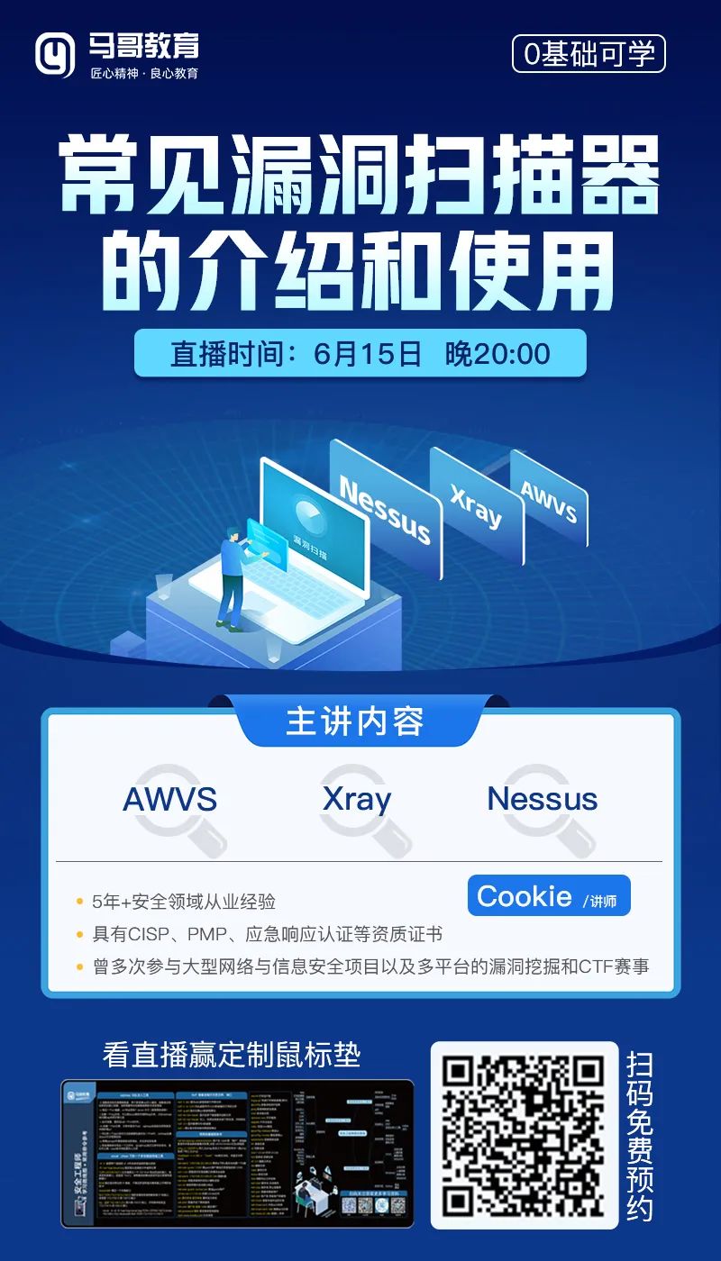 上述文档是基础入门性手册,如果你想具体学习AWVS、Nessus等常见漏洞扫描器,了解更多专业系统内容,欢迎来到马哥教育Cookie老师为大家准备的「常用漏洞扫描器的介绍和使用」免费公开课!