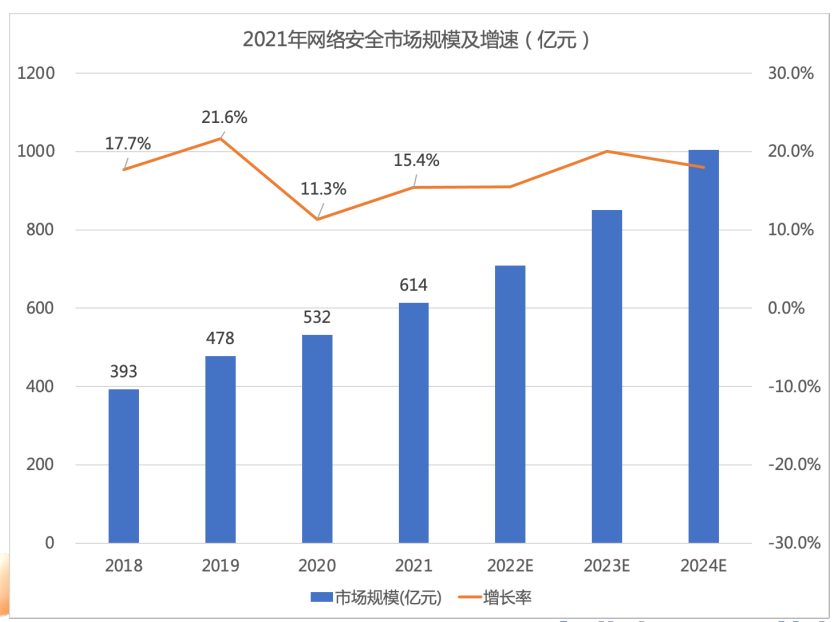 2021年我国网络安全市场规模约为614亿元,同比增长率为15.4%,近三年行业总体保持增长态势,且随着相关法律法规的陆续发布,则进一步激发了网络安全市场的需求,预计未来三年将保持15%以上的增速,到2024年市场规模预计超过1000亿元。