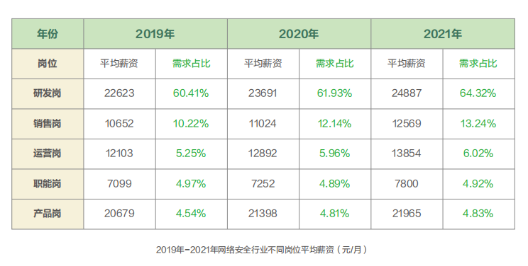 《2021年网络安全产业人才发展报告》中指出,2021年上半年,网络安全领域的平均招聘薪酬达到22387元/月,较于全行业的平均工资偏高。
