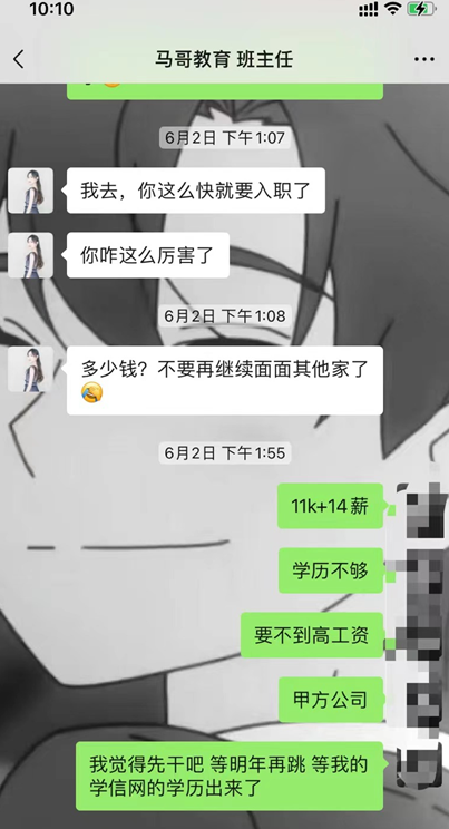 这份工作是11K*14薪,年薪15.4W,当时班主任老师问我还要不要再面试其他的公司,我的想法是自己学历不高,而且第一次从事互联网行业,再面试其他公司可能会有1—2K的薪资浮动,但意义不大。