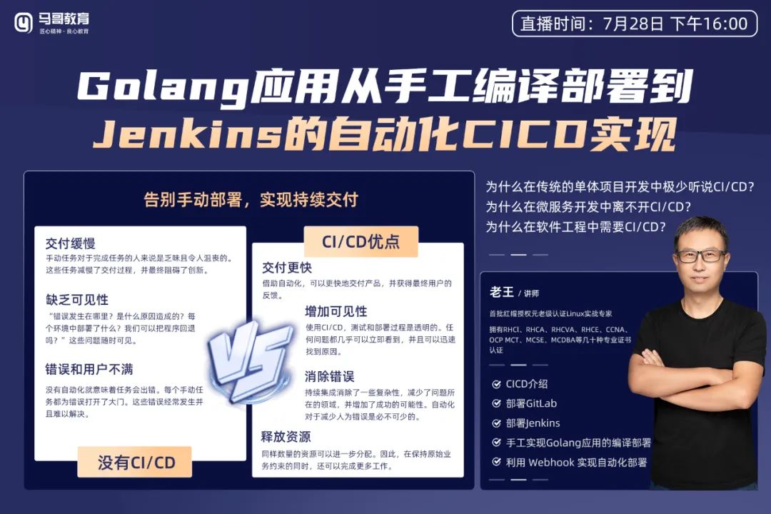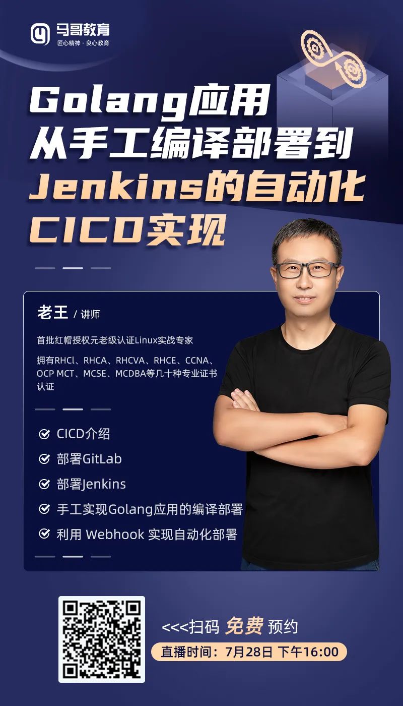 7月28日 下午16:00,马哥教育老王就和大家详细的聊一聊《Golang应用从手工编译部署到Jenkins的自动化CI/CD实现》的相关技术点,帮助大家熟悉掌握自动化部署的架构设计,实现持续交付!
