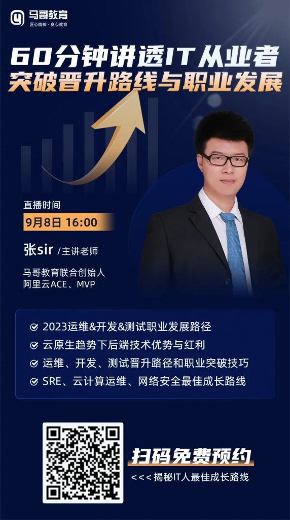 在此给大家良心推荐 9月8日下午16:00,马哥教育联合创始人、阿里云ACE/MVP张Sir的免费公开课,本期公开课张Sir将用60分钟为大家深度剖析IT从业者的职业发展路径,帮助大家轻松突破职业瓶颈,延长职业天花板!