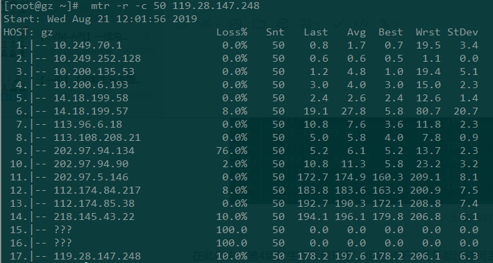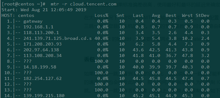 最后一列 StDev 提供了数据包在每个主机的标准偏差。如果标准偏差越高,说明数据包在这个节点的延时越不相同。标准偏差会让您了解到平均延时是否是真的延时时间的中心点,或者测量数据受到某些问题的干扰。