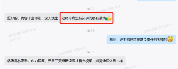 “内容丰富、深入浅出”、“老师带病坚持上课,讲的还很有激情”、“就像武林高手,内功深厚。”