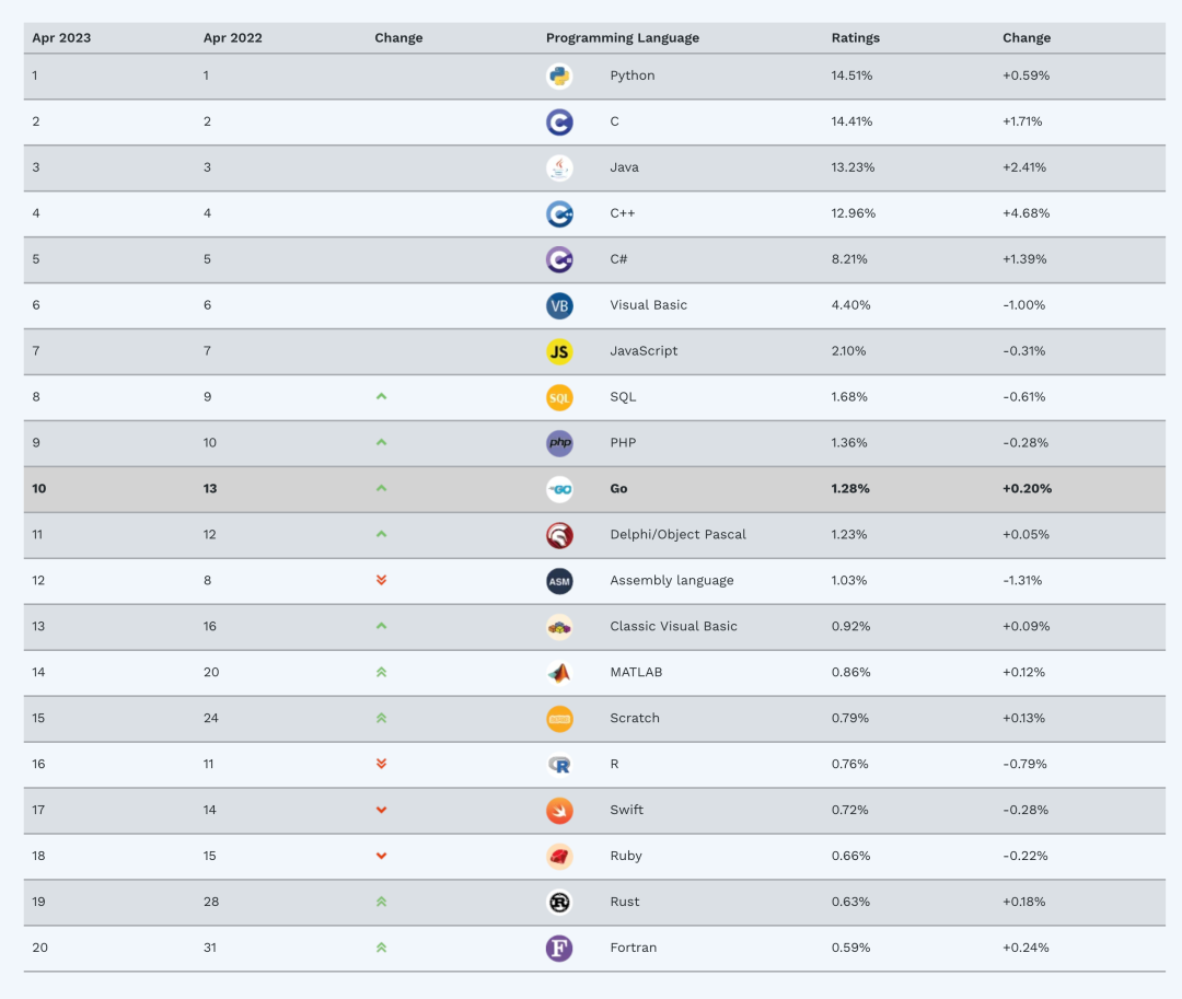 TIOBE 2023 年 04 月份的编程语言排行榜公布