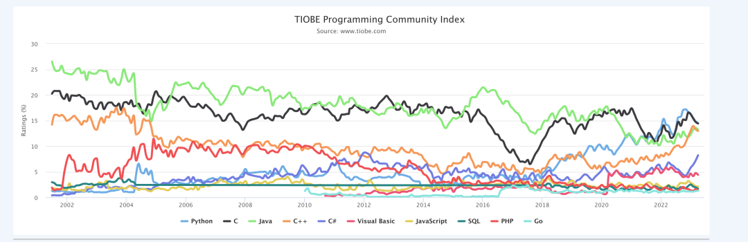 Python,C,Java,C++,C#,Visual Basic, JavaScript ,SQL,PHP,Go 历史变化曲线图。