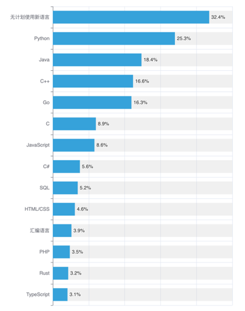 Python是 25.3% 的开发者希望学习的下一门编程语言。可见随着人工智能的发展,Python 的使用量正在逐渐提升,其在开发者圈子也非常受欢迎。