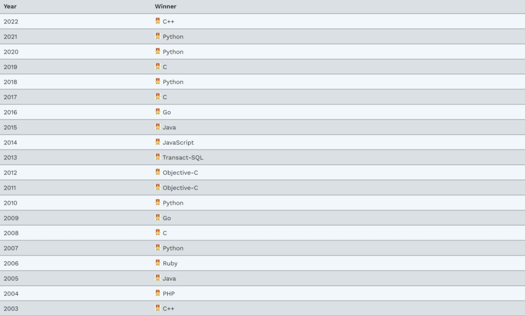 Python,C,Java,C++,C#,Visual Basic, JavaScript ,SQL,PHP,Go。