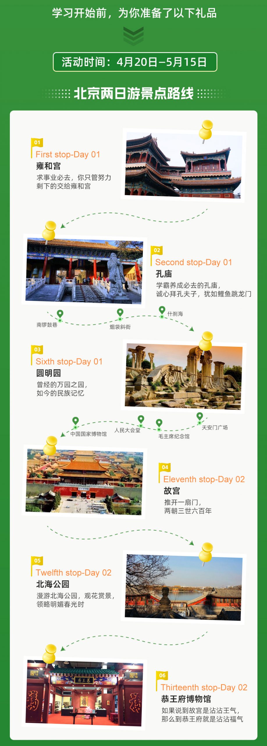 学员宿舍 → 雍和宫 → 孔庙|国子监 → 南锣鼓巷 → 烟袋斜街 → 什刹海 → 圆明园