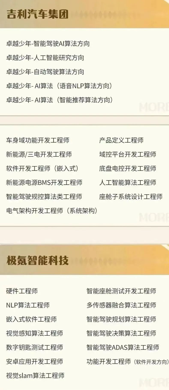500强民族汽车产业吉利控股,在2024届校招提前批中就要招聘计算机/新能源类人才超8000人,岗位包含算法类、测试类、研发类等。