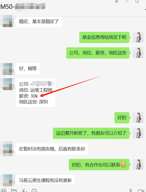 结业后班主任老师也会不定期的跟踪就业情况,跟进学员的进步情况,面授班M50期学员,毕业整一年,薪资30K,选择正确的方向,为之努力奋斗