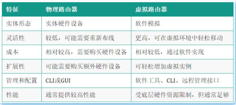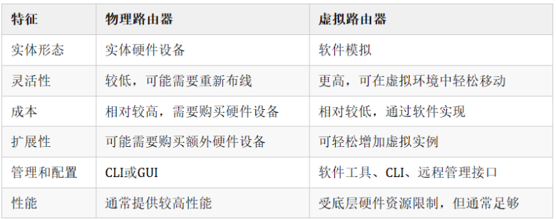 虚拟路由器和物理路由器都是网络中用于转发数据包的设备,但它们在实现和使用上有一些显著的区别。