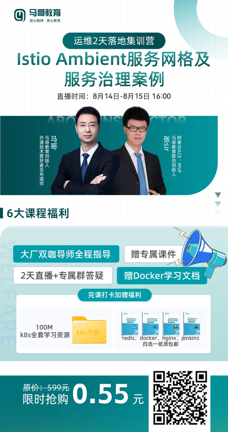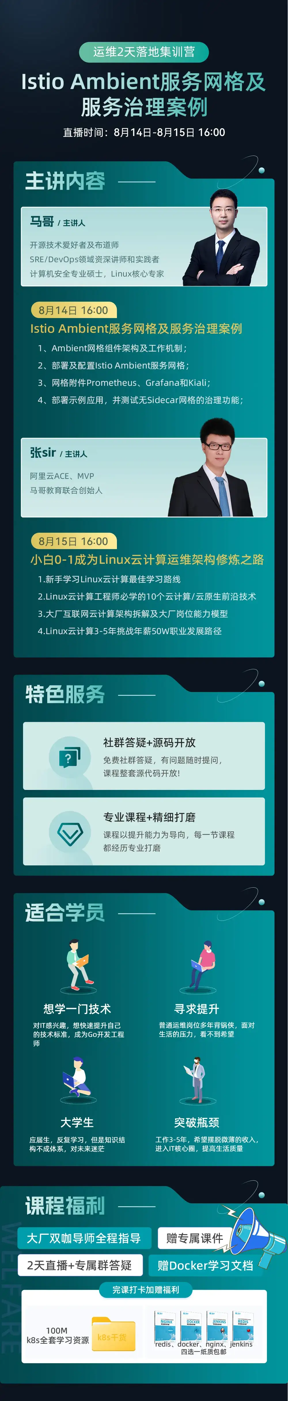为了满足大家对技术的兴趣和学习需求,迎合一线互联网人才需求。马哥教育创始人(马哥)与联合创始人(张sir)强强联手,于8月14日/8月15日特别开启【Istio Ambient服务网格及服务治理案例】2天落地集训营!马哥带领大家主攻大厂高热度技能,张sir带领大家制定学习涨薪路线,金九银十来临之际,把握跳槽涨薪好时机!