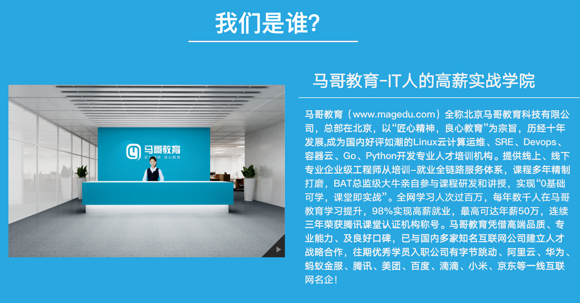 历经多年发展,已成为国内好评如潮的Linux云计算运维、SRE、Devops、网络安全、云原生、Go、Python开发专业人才培训机构!